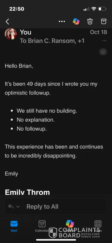 Our building site has been ready since July 3rd, 171 days ago. The building was supposed to be finished in August. Then we were told September. Then it was October. Then it was November. The timeline kept creeping back without explanation. They put our project “on hold†and put other people’s timelines ahead of ours, but without telling us – the date in our contract would come and go and we would have to chase them down for answer. Our salesperson manipulated timelines and advanced projects ahead of ours and, of course, lied to us about it. He was ultimately terminated, but absolutely nothing was done to make things right with us or to compensate for several months of delay—despite assurances from our new salesperson, John, that the project would get back on track. We escalated our issue to Brian at corporate, who replied once referring us to Clint (the regional manager) and then stopped responding (see photos). Clint never responded at all.