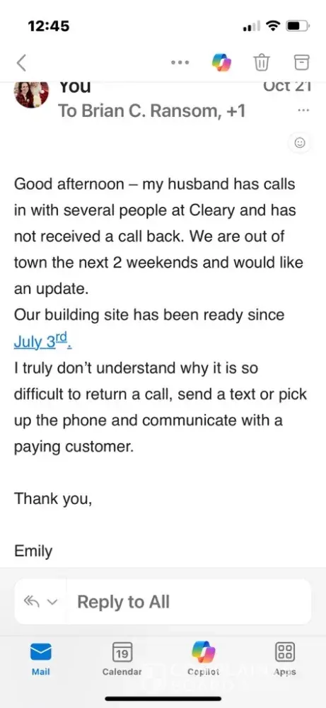 Cleary Building Corp. is fully aware of this particular situation and we have addressed it with our Client. We are working to make sure the project proceeds in a timely manner. I spoke with the Building Specialist assigned to this job, to get more details about the Client’s concerns. Yes, there were delays, many were out of Cleary’s control, not all. Initially, we made attempts to contact the Client to set up a time to do the repairs, but we were unable to connect. When we finally made contact with the Client, they wanted to make sure they were present when the repairs were being done. We attempted to accommodate this request. On the morning of the scheduled repairs when the Client was available, it was discovered, in fact, that Cleary’s fenced-in storage yard had been broken into the night before and tools were stolen from the trucks - which delayed the repairs further (repairs had to be rescheduled again). When we got re-tooled and went to load the steel to be installed (for the repair), we noticed it had been run over by a landscaping company’s truck (not Cleary’s truck). We called the Client about the situation and sent them pictures letting them know the steel was damaged and that we would reschedule once again when we received the replacement steel. Please understand that Cleary has been corresponding with the Client and we do have a plan of action in place to resolve the issues at hand. The delays have been lengthy due to these circumstances and we apologize for those delays. Our focus remains on providing the Client with the highest quality building. As I have already expressed to the Client, I stand ready and available to assist them with any further issues or concerns. - Don Herron, Cleary Building Corp. Region Manager