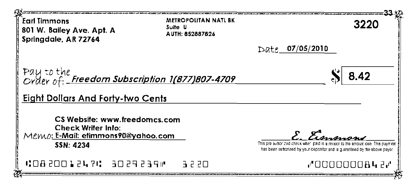 I noticed on my bank statement on Jul 30, 2010 that there was a check payment made out to Freedom CS that I did not agree to. The check has my email address as a signature along with the last four digits of my social security number. The check was mde out for $8.42.