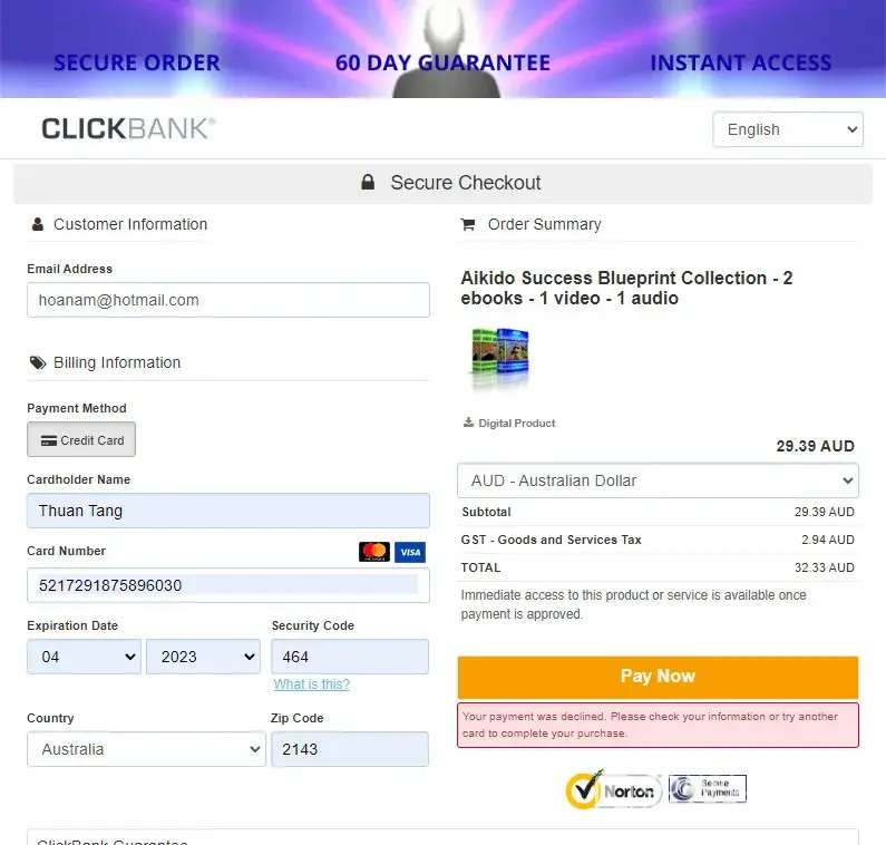 No matter what I do I cannot buy anything on Clickbank no matter what card I use it always says payment declined or there is a problem what is going on? I am getting very very annoyed with this company now.