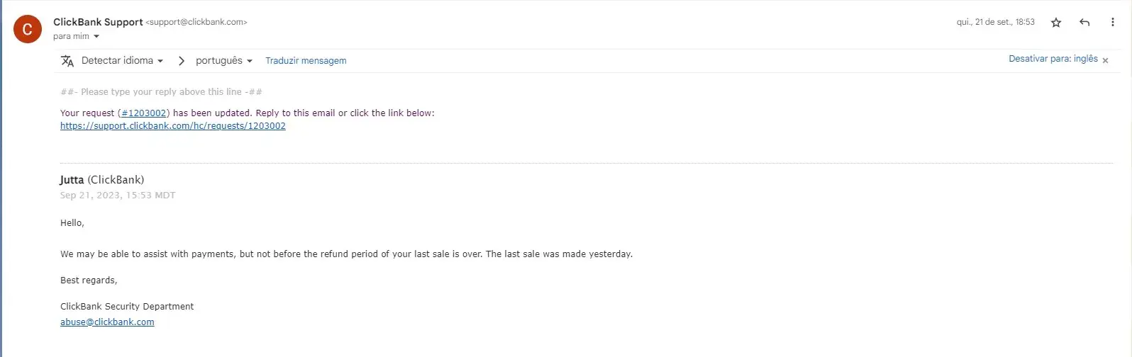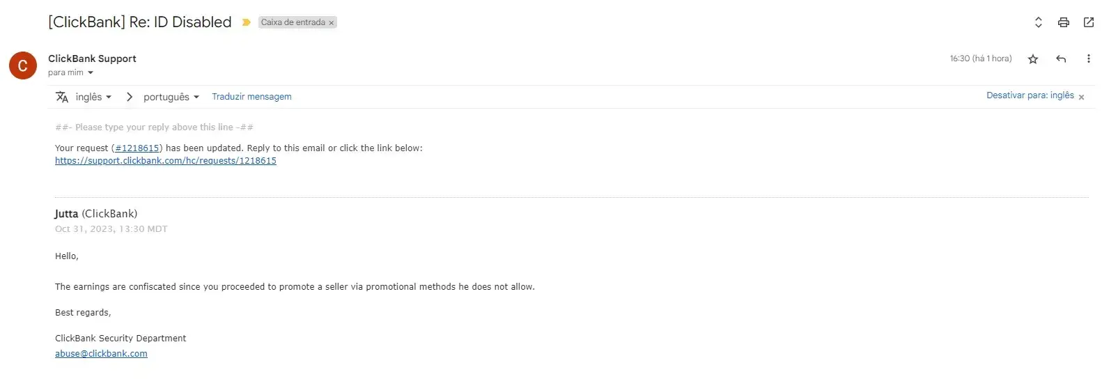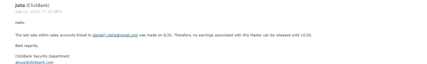 I have an account for 1 year as an affiliate of clickbank. In July I had my ID completely blocked by them under the allegation that my account was with a high number of chargebacks. They asked to return after 60 days. And so I did. But when I contacted after 60 days, the attendant Jutta told me that I would not be entitled to my commissions at that time (approximately 1,600 dollars) and that my account would be permanently blocked because it was identified that I continued advertising products through other accounts created. Which is a lie. She told me that I would have to wait until 10/26 to receive my commission (as I see attached). Well done. So I did and waited another 45 days. I contacted Jutta today and she claimed that my commission will not be paid because I violated product disclosure rules, which is a lie, since she has no way to prove it. I leave here reported my indignation because my account was totally blocked and my commissions (about 1.6k dollars) completely blocked by them, being that I live in Brazil and had to borrow money to pay my credit card bill for making the ads. Some of my blocked account IDs are: dvbq89; baapl; baapl2. I feel completely deceived by clickbank, since it is claiming something that is not true and not paying me what is rightfully mine, which are my commissions.