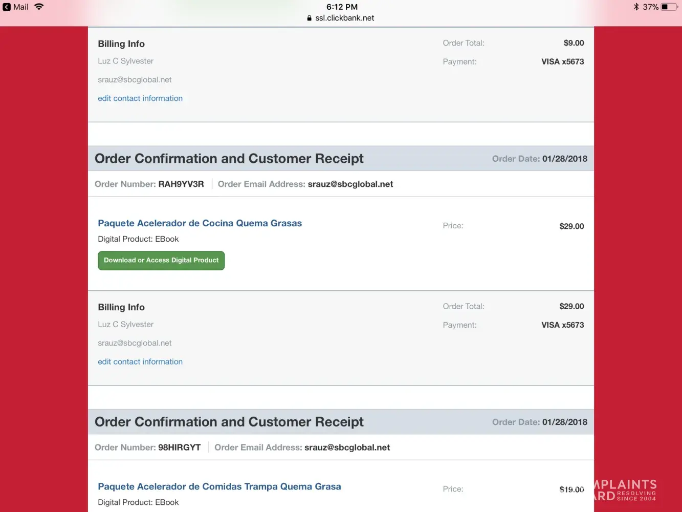 I live in Australia, was visiting in Canada and having trouble with my feet. I purchased an eBook for the treatment of Plantar Fasciitis- paid for it with my credit card and the eBook was sent to my email address.I am having trouble with my BIGPOND email and I never received it. The transaction on my credit card statement is as follows: CLKBANK*COM_JZQ24YET [protected] ON FRGN AMT: 54.13 Canadian Dollar.