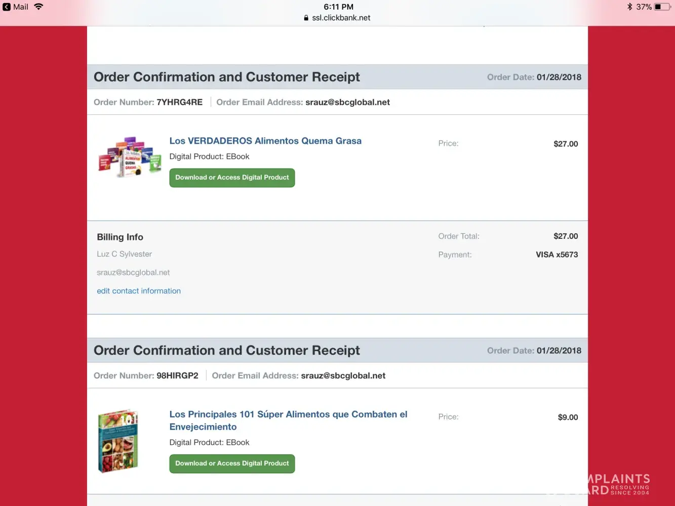 I placed an order and I was told that I would receive my order confirmation in my personal email [protected]@sbcglobal.net, but I didn't receive anything! My order confirmation is 7YHRG4RE. Purchase date 1/28/18. I need to know what kind of people are you, scamming honest people, like me that believed everything the advertisement said. All I wanted was to better myself by learning what was the "good food that I'm supposed to eat to help me lose weight".