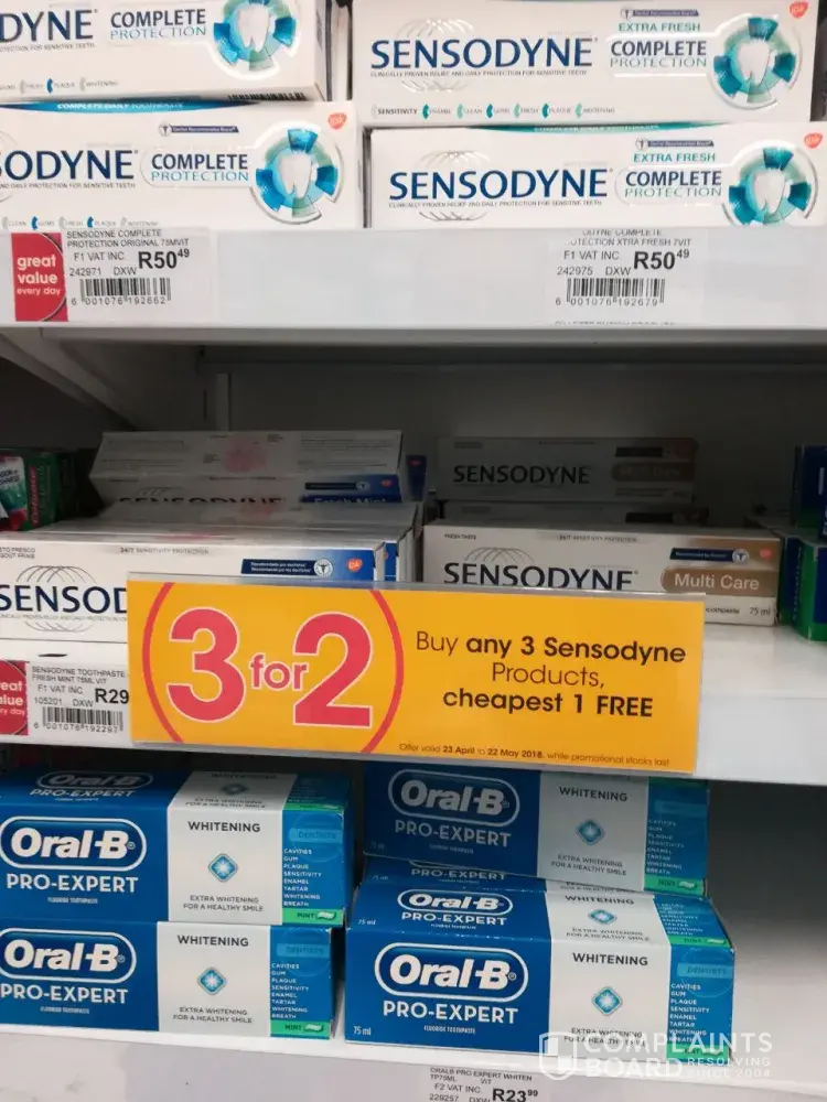 On the shelf at Clicks Fichardtpark in Bloemfontein, was an add stating "Buy any 3 Sensodyne products and get the cheapest free" (See picture below). I took 3 Sensodyne protects toothpastes to the till point where I were advised that the Sensodyne protect is not part of that special. That is false advertising. Nowhere does it state that there are Sensodyne products that is been excluded. Unacceptable.!