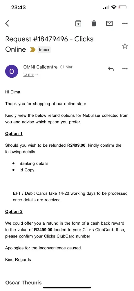 On the 7th of January 2021 I bought 2 nebulizer for R5000.00. Only one was delivered and the other one I was told they would investigate what happened within 7 days. I kept calling their online customer service and they would leave me on hold. I then sent an email to customer service in February demanding a refund into my account as I purchased another one elsewhere after waiting for a two months for clicks delivery. 3 days after the email sent, the nebulizer was delivered. I called the online customer care to tell them to collect the nebulizer as I didn't need it anymore. In two days they came to collect. I checked the app to see if they credited my account because they were just quiet. Two weeks later, no credit or communication. I then called them to enquire about my refund and they acted confused as though they don't know what I'm talking about. When I hanged up I received mail from clicks state ting the documents I have to include for my refund. This was on the 1st March that they responded they will refund me between 14-20 days. I called them to argue why I have to get my money in 14days if I paid on 7th january, then I was told it's procedure and they will try to push it up as they inconvinenced me. The person who was communicating with me is Oscar Theunis, who is suppose to be assisting me. I have called him on the 20th March to check why I'm not refunded yet, he told me it's held up by finance department. I asked him to send me an email stating when I will get my money back, he responded that he will, but he never did. Now when I call he leaves me on hold so that I end up hanging up. He doesn't respond to my email. We are in April now. I buy a lot of things online, I have never experienced such poor service. When I return things I bought online, within 2 days the money is refunded in to my bank. Clicks is such a big company comparing to the other shops I do online but the service from the onlinestaff is Unacceptable. I cannot be calling such a big firm asking for my refund for 3 months. I have been to the store a lot of times, the staff is friendly and helpful. I decided to do online to try to beat the long COVID queues. But now I wish I went in store.
