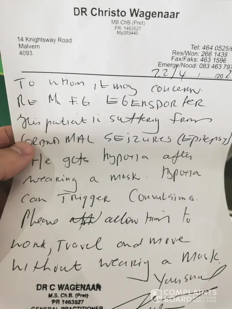 We have rights and nowhere in the law does it say we have to wear masks, so the government sneaked a "rule" into the State of Disaster, which actually discriminates against those who actually suffer from a serious disability.