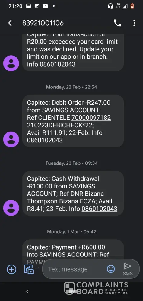I been trying to reverse my money because clientele have taking my money without my concern since the beginning the year. Please stp debiting my money.don't have a choice but to refer this matter to ombudsman as I have trying with the bank after that they are no longer debiting on the last day immediately I have money in my account they take my 200