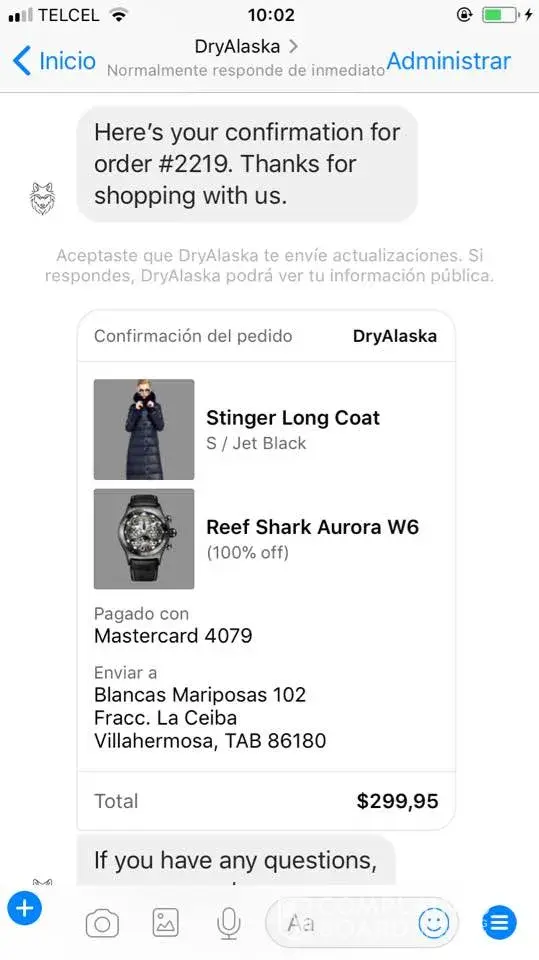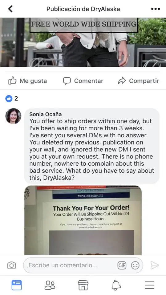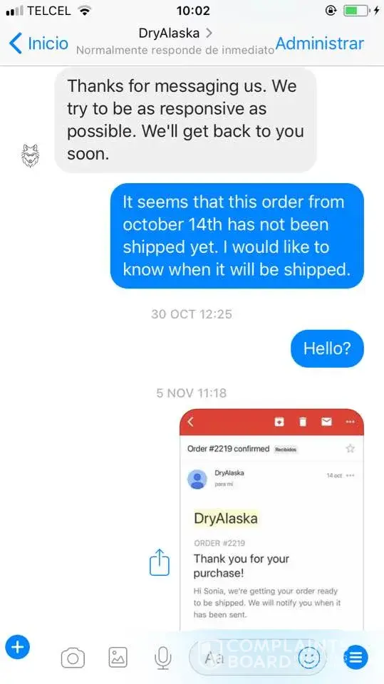 I made an online order on dryalaska.com on 10/14. My order was #2219, and it cost 300 US dollars. It was the "Stinger long coat": https://dryalaska.com/collections/womens-parkas/products/stinger-long-coat I got an email saying that my order was confirmed, but I never got feedback after that. I emailed them (to their gmail account, the only one they...