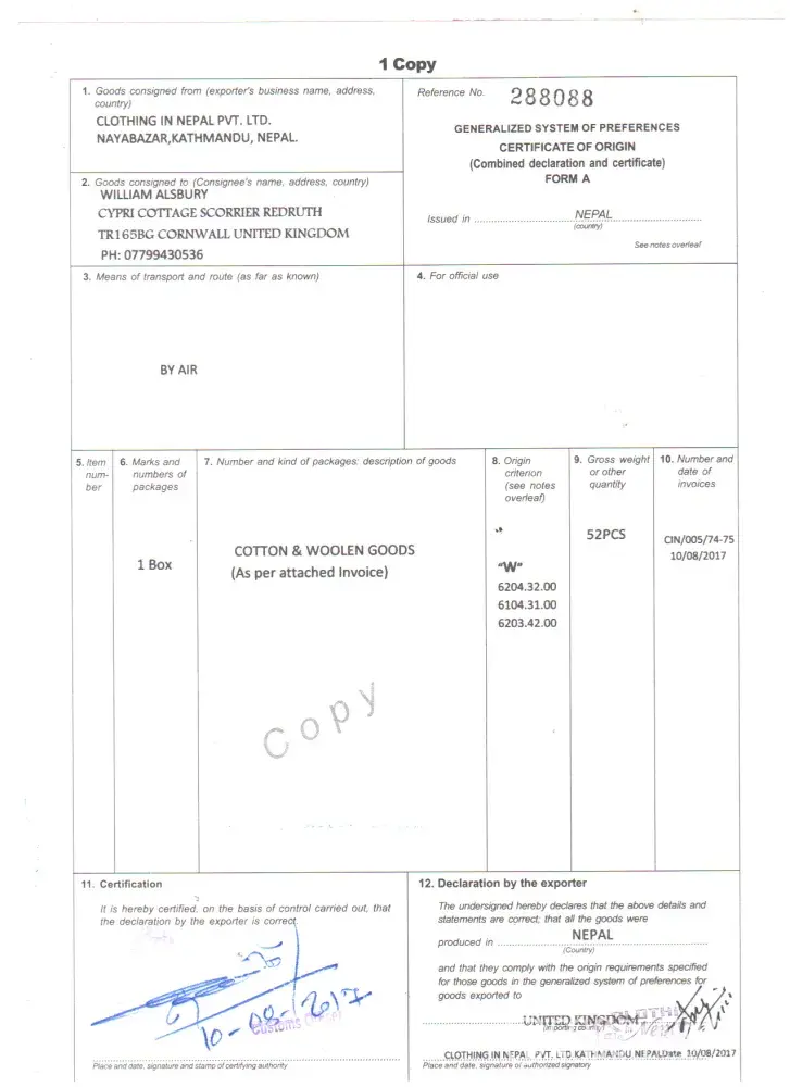 I place an order with Clothing in Nepal. Paid in full. They just make excuses and say they are waiting for the export documents. I have been waiting 3 weeks. I think they have scammed me. Don't buy from this company.