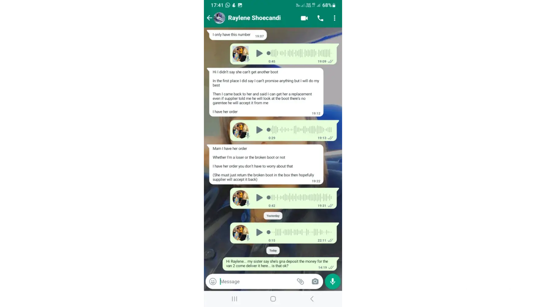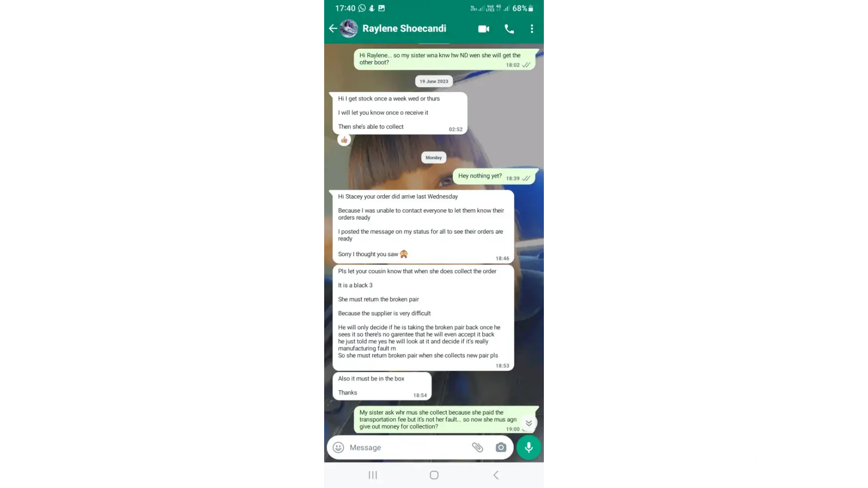 I am complaining about a woman who buys in bulk at milano footwear and her company is called shoecandi. I order a pair of boots in the tan color, she sent wrong color and accepted that, paid the boot and drlivery fee for the van. Then I wore it for the first time and the right back support of the heel collapse and then I sent her pics and a video but she...