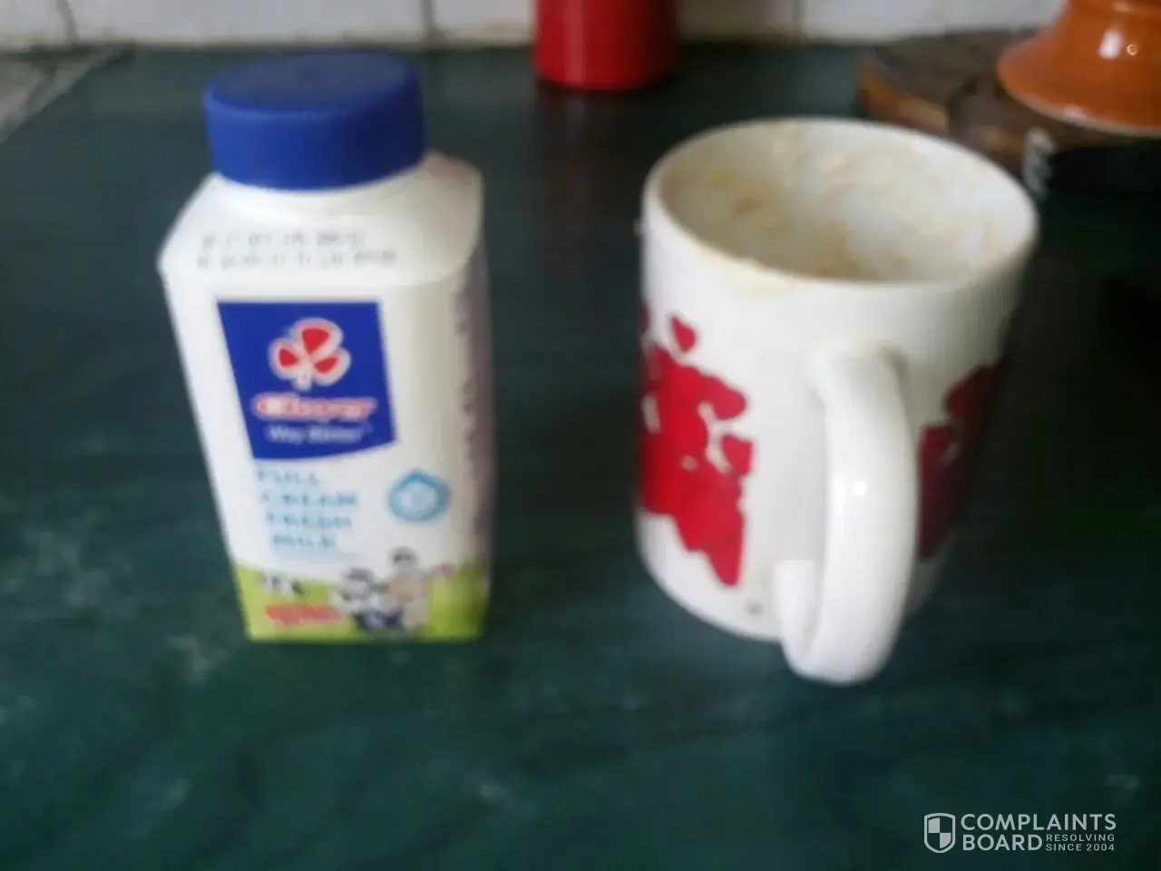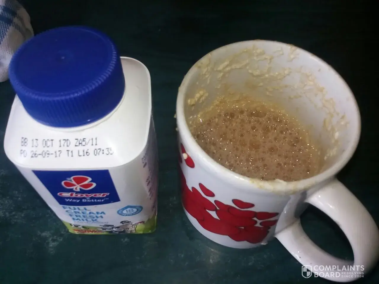 to whom it may concern? I've bought a small bottle of milk for my breakfast today, after a boiled the water and poured it from kettle into the cup I put milk into the cup. It a couple seconds later when the milk turned thick and discoloured the milk started to smell in the cup I was frustrated and furious coz I was really feeling to have a cup of milk tea. I was pissed off, I've check the expirery date and it looked fine so I had to go back to the shop and explain the shop keeper about the off milk that I had, he did refund me the money back however my wife and couldn't believe the poor product that clover had sold to us as the consumer band i had to take my daughter for extra tuitions coz she's in matric and this got her late for her classes We always buy clover and we know that's its the best im a very very unsatisfied and disheartened consumer which clover had to put me through all the inconveniences because of a spoilt milk