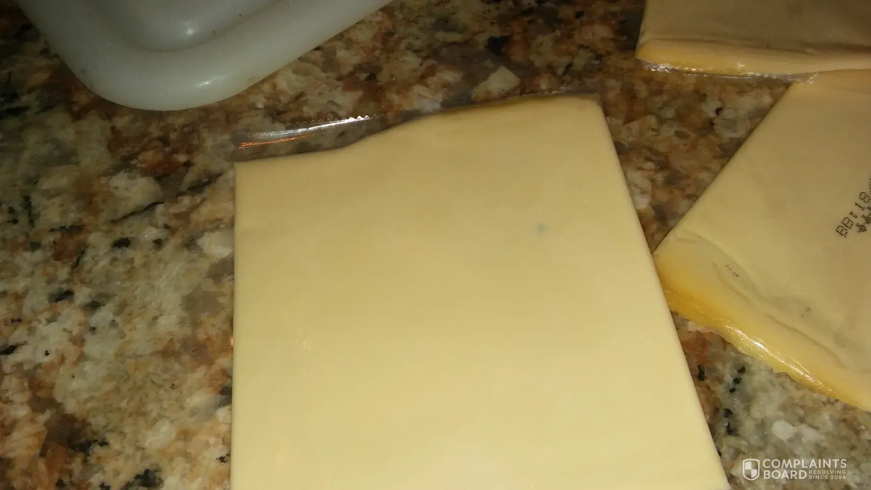 Clover Gouda and Cheddar wrapped slices 900g (54), I regularly buy these products and to my disappointment, the last 2 that i purchased have a piece of black substance in them (rust ), the edges are not sealed and hardened the cheese that has seeped out, and this is in most of the pack of 54.