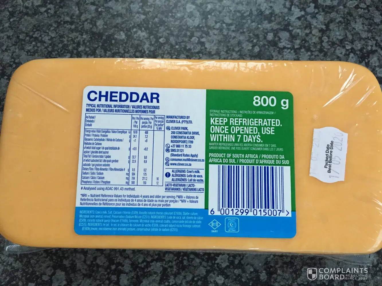 Good day. I have purchased a block of 200g clover gouda cheese from checkers cornubia on the 19th January 2020. I was very disappointed upon opening, it was green and white mould (rotten). Please assist as I had purchased this for my daughters lunch. I would appreciate a response from you asap as the expiry date is on the 06 January 2020. My email address is marilyn. [protected]@gmail.com