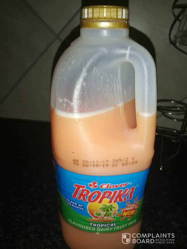 I bought a tropika juice (2l) today n gave my 2 year old son a glass of the juice. He immediately started crying n saying his tummy was sore, upon inspection of the juice I noticed that it was a bit foamy and when I tasted it, it was completely sour. So disappointing as the expiry date is only the 30th of November. For further information please call me on [protected] or [protected] as I need an explanation... It hasn't even been a week into November and the juice is already off. I have attached a pic for your reference.