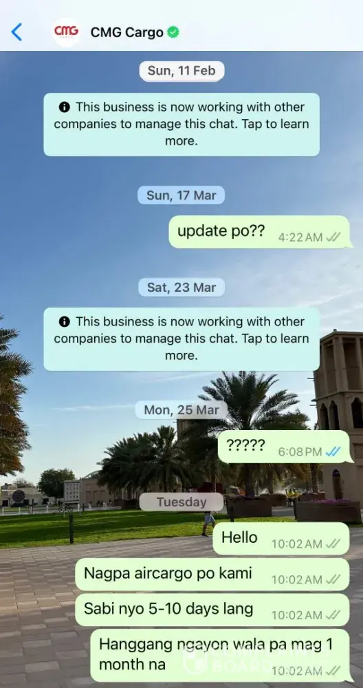 As I sent my box last august 15, knowing that still have ample days for my mother birthday 78th birthday tomorrow (november 24), since my experiences with other cargo companies, I experienced delayed during peak season for only 5 days, knowing that its not peak season yet, but its already 98 days, and if I track no complete details where is my box, no status if its already reached to tagbilaran or cebu where it is? I already reached out those numbers in whatssap but nobody replied, what service is this? Not again with cmg, im so sad with my mother birthday, plan is ruined because of irresponsible and poor service, its my bad why I didn’t check the reviews and complaints ðŸ˜ðŸ˜ðŸ˜