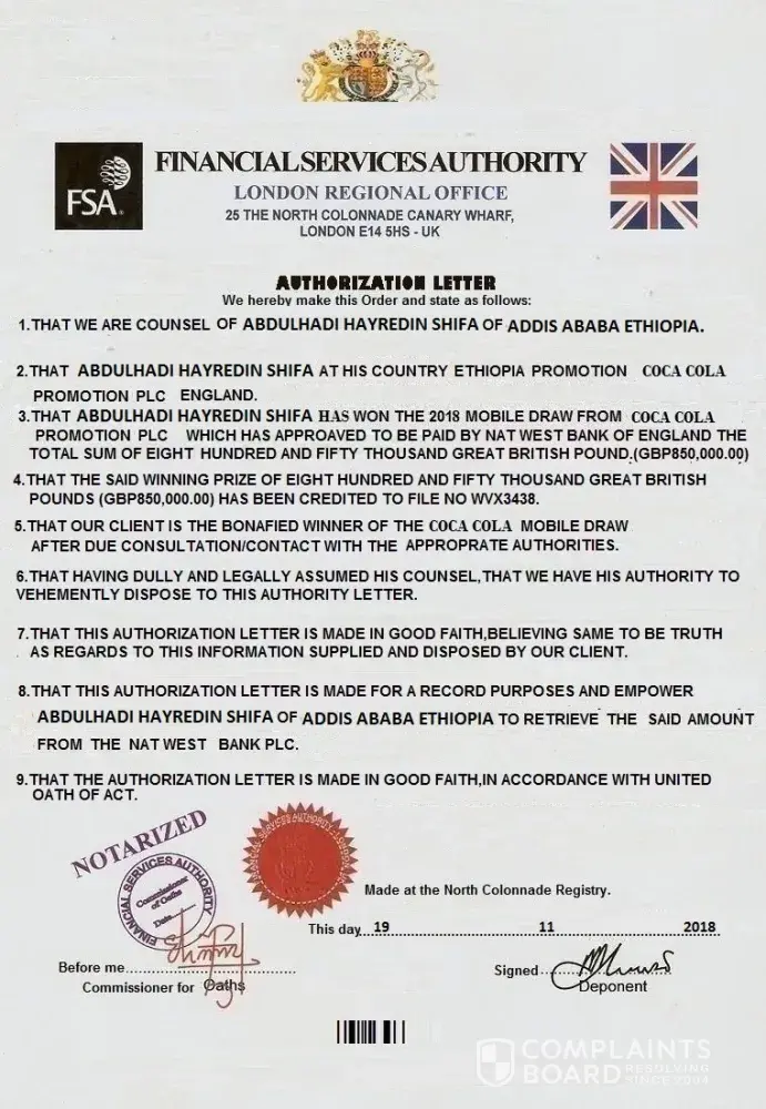 I have received conformation from natwest bank plc, london that i have won coca cola mobile draw award worth 850, 000 gbp in the draw of phone number and that my money is available at the bank. The bank have asked me to fill the form in my email to process my award after which they will let me know the procedure for collecting the prize money. Below is the meassage of the email that i received from the natwest bank(coca cola) .