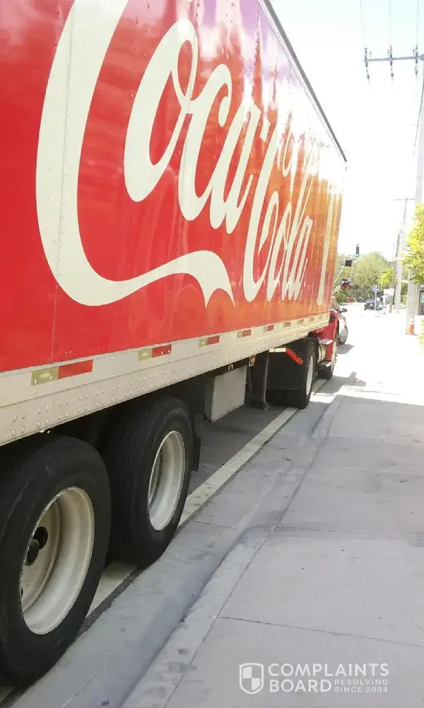 On 8/24/18 at 12:00 pm off of Las Olas Blvd in Fort Lauderdale, FL, a Cola-Cola truck was blocking the driveway from me exiting, I went to the workers that were in the back of the truck, unloading for a delivery and informed then that they were blocking me in.