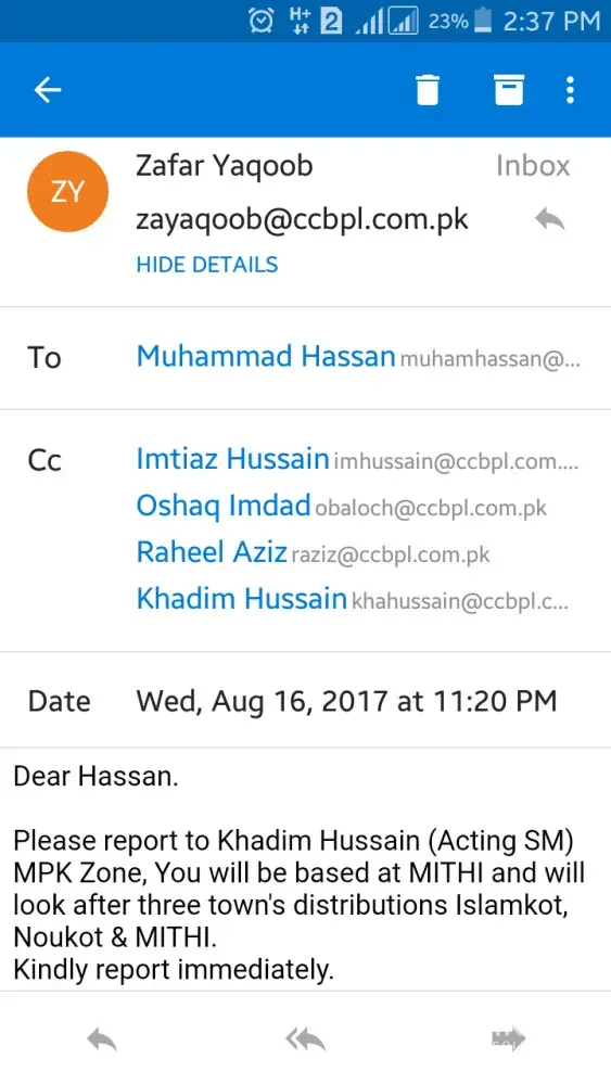 Unfortunately, all the scenario turned against me. The distributor blackmailed the managment by giving threat to join Pepsi and he demanded for punishment to me. On the same day, late night, my RSM called me having TCM, SM and distributor on conferrence; the TCM talked rudely and than humiliated me. Within half hour I received mail in which I was transferred 500km away from my here. I also received message from manager to accept the transfer without any voice or I will be terminated.