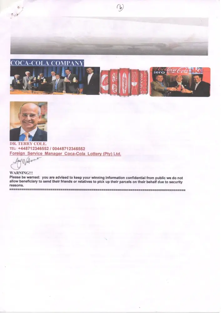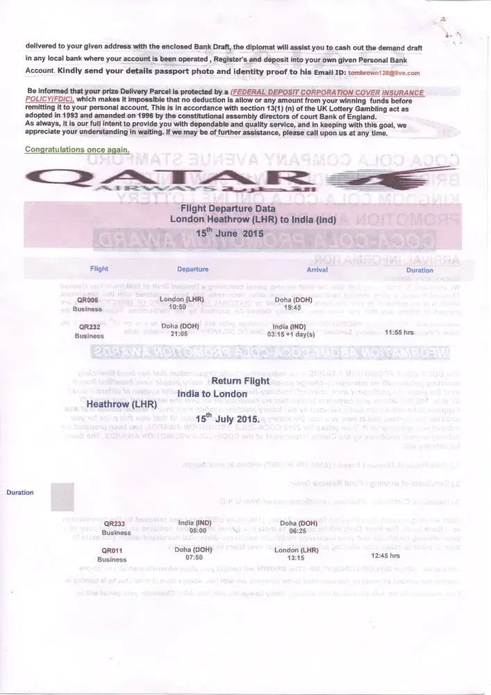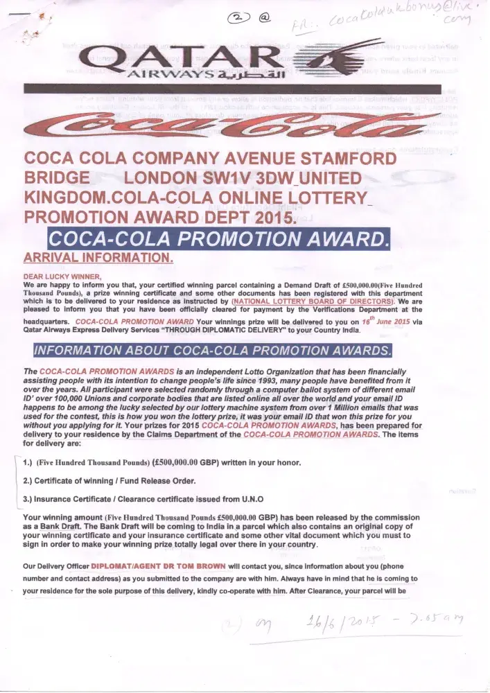 Sir, I received Emails dated. 12nd.June, 2015 & 16th.June, 2015 from A-15 - [protected]@outlook.com & cocacola.[protected]@live.com as I won the prize, please let me know whether the mail is TRUE or False and really I won the prize because unknown persons calling me to deposit the payments for transfer of fund in my accounts, Name:Dr.TOM BROWN- DIPLOMAT Coca cola Co.UK in india Mob.Nos are+[protected]/+[protected] and RBI Manager Dr.KIRAN K.Mob.No.+[protected]. Please do needful.