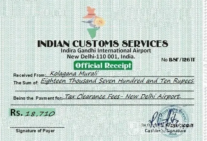 Be informed that in accordance with the british financial service authority and indian government agreement, you (Beneficiary) are required to arrange for the clearance charges of your consignment which is 17, 500 indian rupees which you shall send across to the diplomat as soon as he arrives in your country india which he will use to clear your consignment fund to enable the airport authorities release the consignment / fund to the diplomat for the final delivery to your house address.