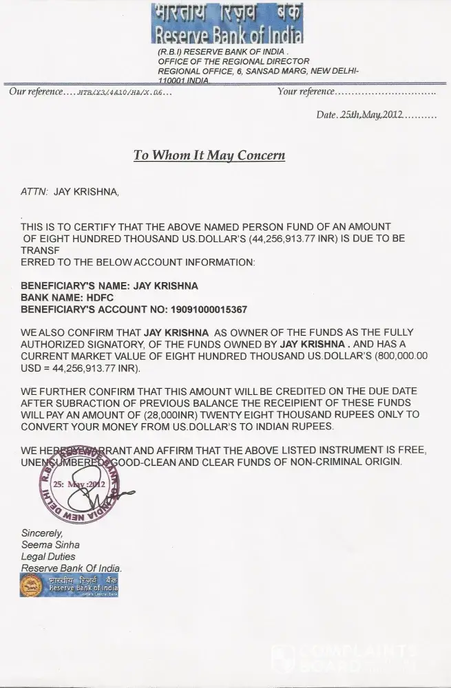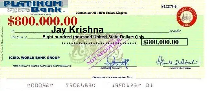 The foreign exchange department of the british high commission to the reserve bank of india are the one to endorse your name on your cheque /fund release order to authorizing the reserve bank of india to transfer immediately the sum of 800.000 to your bank account.