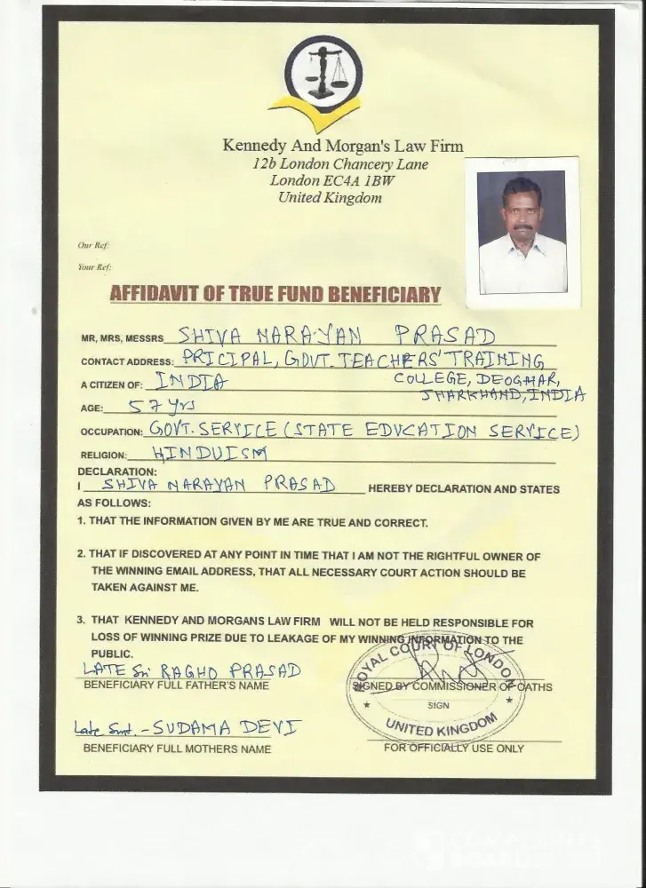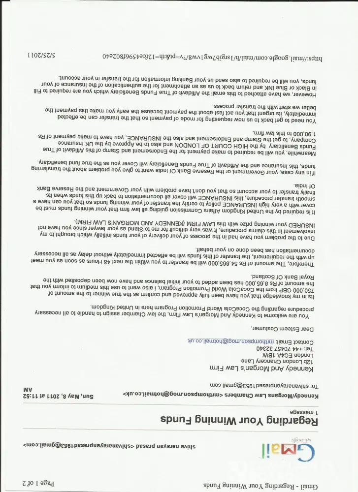 When I had complant to you, your answer are given on this page. The so called winning payment center had informed me that I was the real winner of the so called above prize. I was also informed that the money expended by me has been added to this prize, and directed to contact kennedy and morgan's law firms, london. I did so. The so called advocat also tried to cheat rs 1, 90, 000.