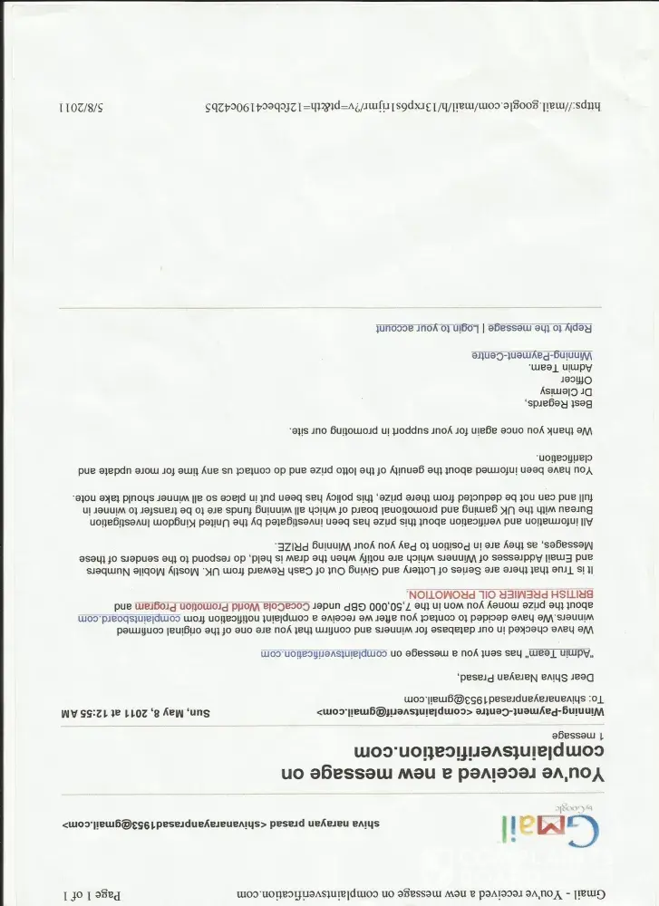 I received an email from coca-cola company on dated [protected], about my winning prize OF J 1, 000, 000.00 one million British pound, monthly 2012 draws held on 4th April 2012,