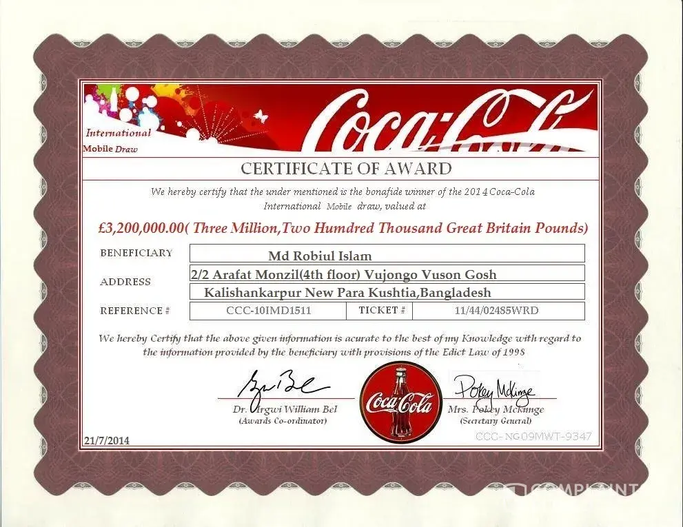 You have been awarded £3, 200, 000.00 (Three Million, Two Hundred Thousand Great Britain Pounds) by Coca-Cola United Kingdom. This award is no doubt, e momentous achievement in the history of our Company, a great opportunity for us to show appreciation to our Customers' patronage, and to help them contribute to the development of their communities.