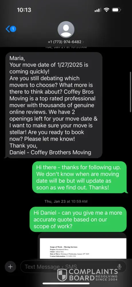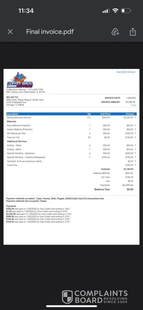 I am writing to formally file a complaint against Coffey Bros Moving due to their deceptive pricing practices, gross mismanagement of my move, and overall unprofessionalism. This company engaged in predatory business practices that resulted in me paying nearly $4,000, despite initially being quoted only $900.