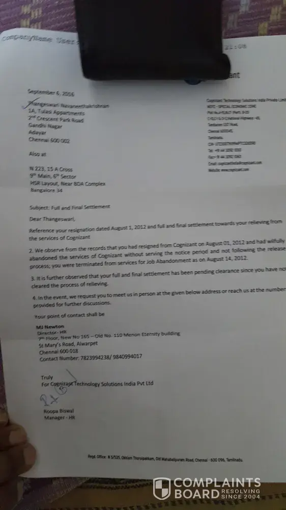 Thangeswari is still getting harassed by Cognizant INdia from 2006 to 2016 who are sending silly letters instead of payment of dues on time.