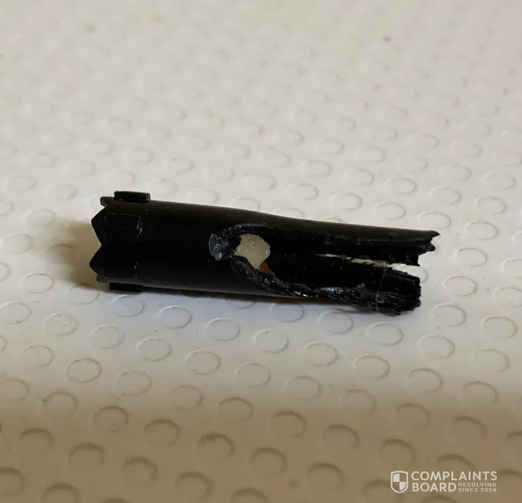About half way through the packet and at approximately 9:45pm whilst operating a mining Haul Truck, I place a few almonds into my mouth and began chewing. I bit down and felt an heard a crunch and felt something sharp catch the back of my throat as I swallowed. As well as a pain to my top right rear moler. At the same time I had what I thought was part of an almond trapped between my clenched teeth from biting down. I reached into my mouth and removed a hard piece of cylindrical plastic with a section missing. Presumably the piece I believe I swallowed?