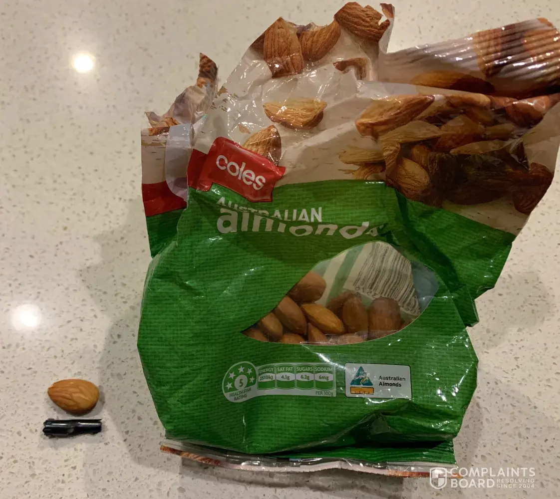Hi Guys, I am writing to you to advise that a couple of nights ago I opened a packet of the above mentioned almonds purchased from Coles Birkdale Qld.