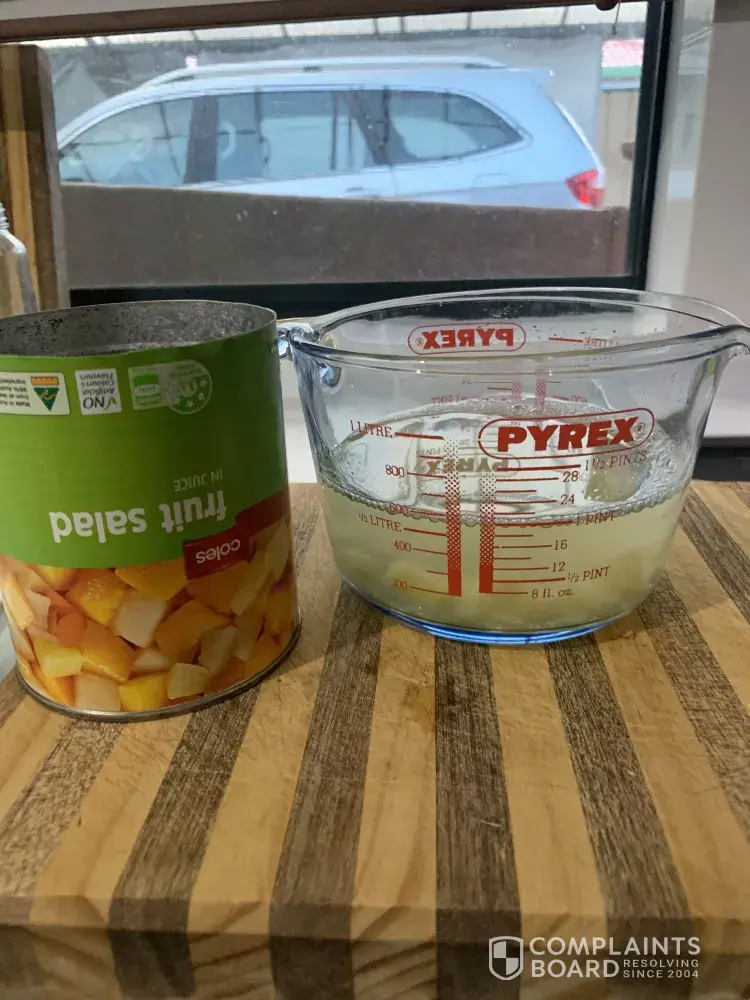 I opened a tin of 825g of coles fruit salad in juice, and I was shocked I straight away noticed that the amount of juice and fruit was way to low, the juice was only just half way up or the tin, and all the fruit that was in there was pineapple and only 20 pieces.