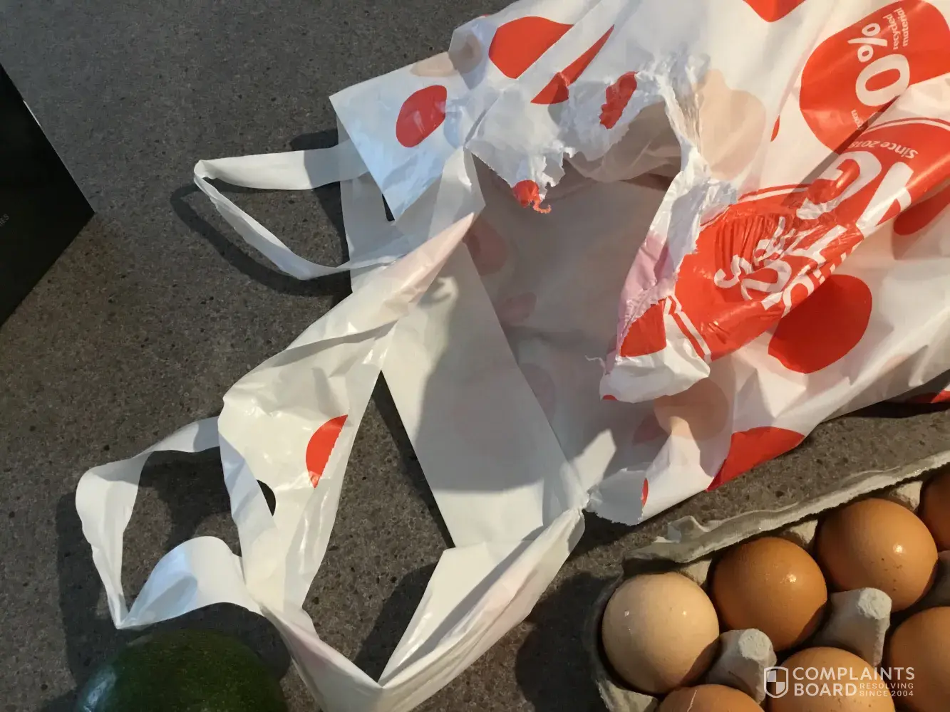 Hi there, I did my shopping at Coles Lismore yesterday Thursday 29th August. After Coles I headed straight for my car to go home. I got approximately 10 meters from my car and the handle on the bag I had paid for from Coles completely ripped away causing the bag to drop to the hard ground of the car park. I had 2 cartons of eggs in the bag which broke...