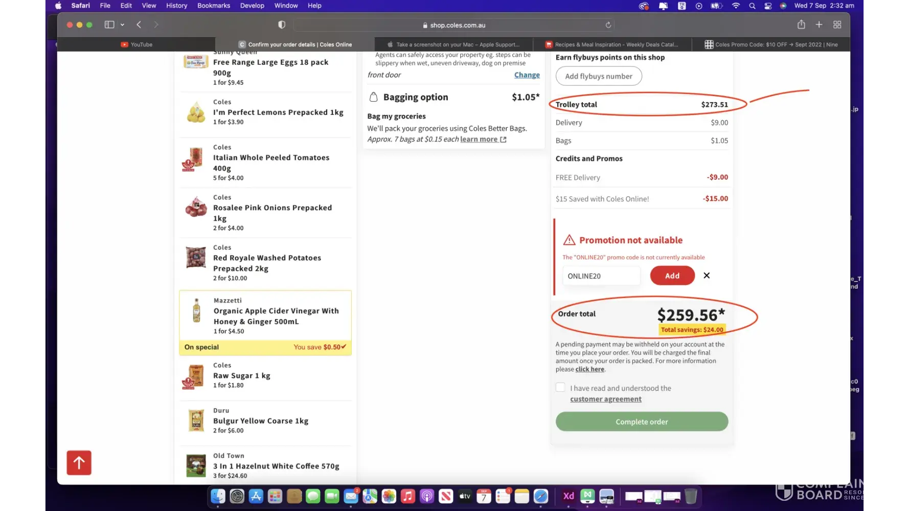 Coles cannot use an accountunting trick, adding up total $250.32+$23.15 discount = trolley total $273.51 than after recalculate find out order total $259.56