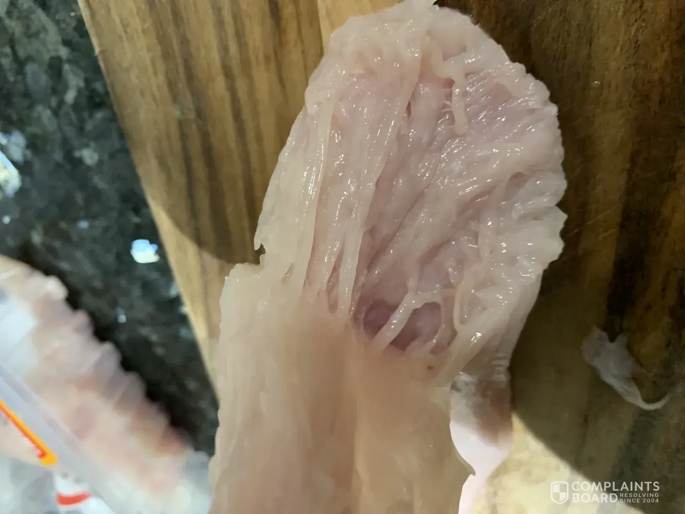 Just sliced into the end of the chicken breast I purchased this evening to make dinner, however I notice something odd, do you know how much brine has been used in just one small chicken breast for it to have been this stringy whilst raw?