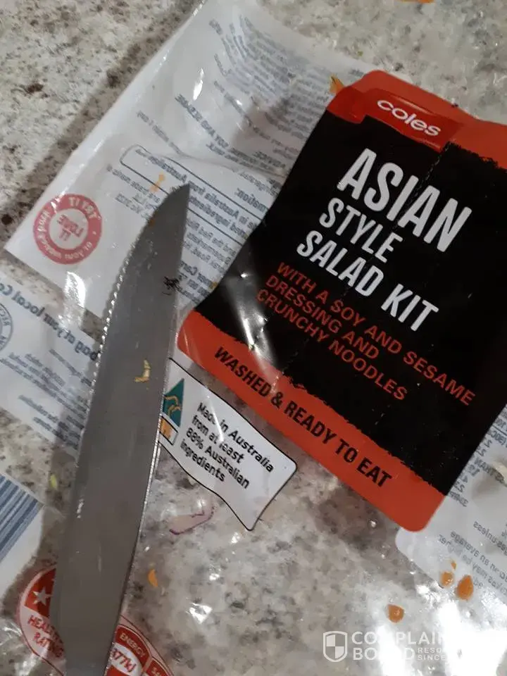On the 1/12 I bought a prepackaged Coles Asian Style Salad Kit from Coles (Wyoming centre) to have with my dinner, I constructed the salad and then served it, once it was on the plate a small black spider crawled out from within the pile of salad.
