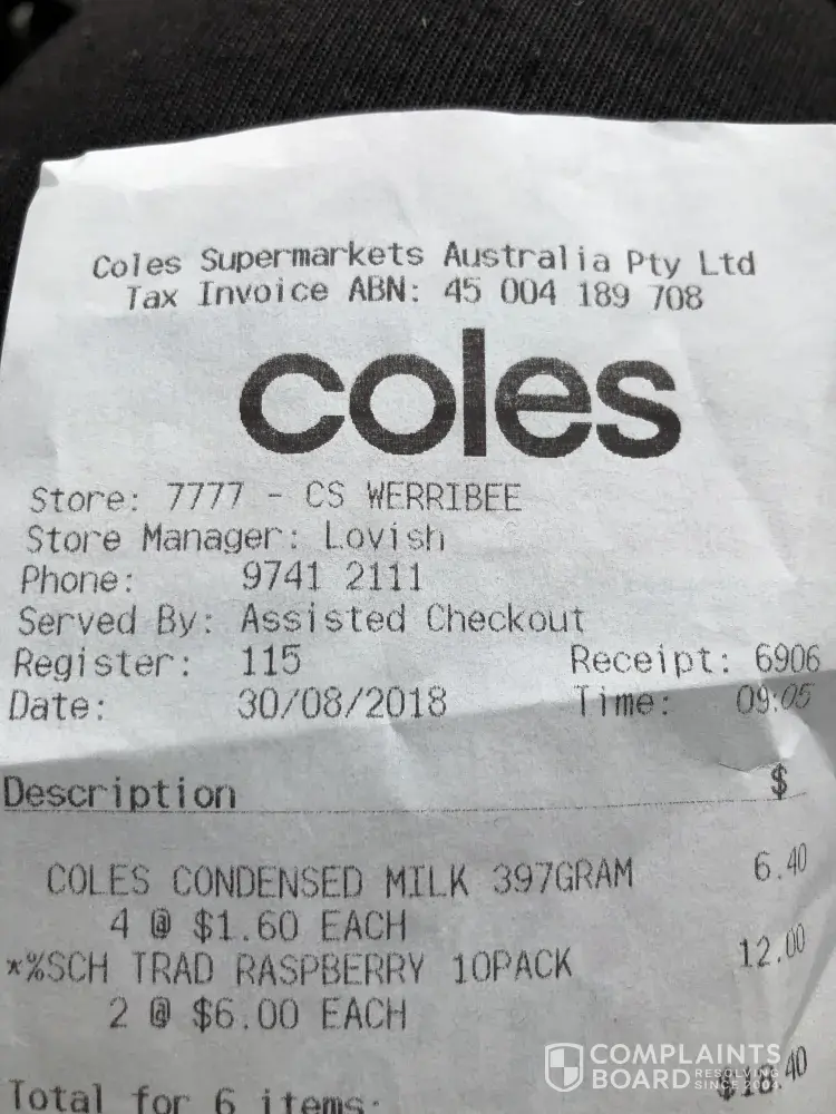 I went in to Coles 7777 -csv Werribee store and searved myself on Register 115 at 9:05am to buy a few things that I forgot the day before. As I was in a rush the day before I forgot to ask for my 3 mini collectibles that I was entitled to according to my receipt .
