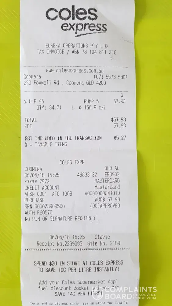 I thought you may be interested as why neither my wife or I will buy petrol from Coles Express or will shop at Coles supermarkets.