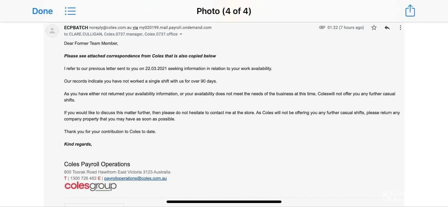 This is such discrimination as there are other individuals that are getting shifts on the weekends and evenings and poor treatment by coles as she has just received a letter saying she has not made herself available and contacted the store regarding shifts, which we have multiple messages that she has.