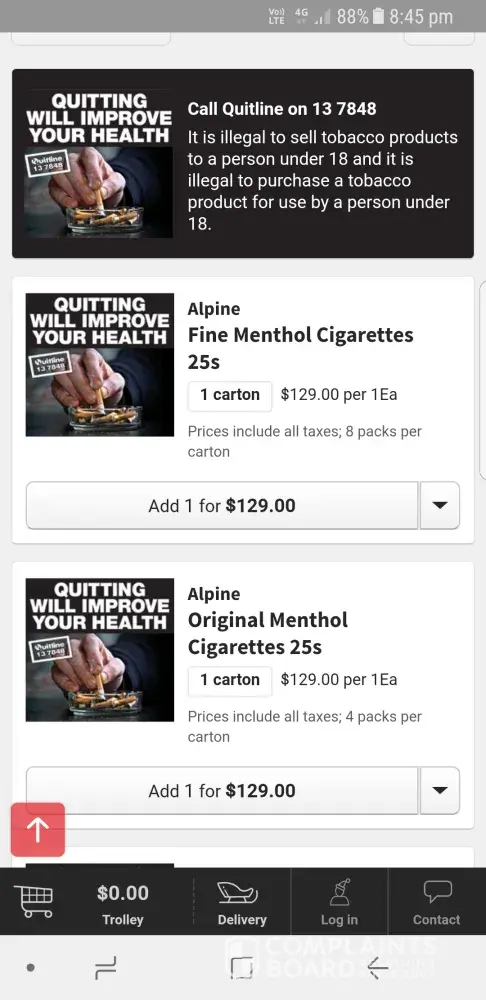 Www.coles.com.au website alpine cigarettes 25s carton says it is $129 for 8 packets. Coles Windsor NSW coles Riverview says its $129 for 4 packets per carton. I argued with the cashier and was refused the 8 packets 22nd Novemeber 2017 at 845pm