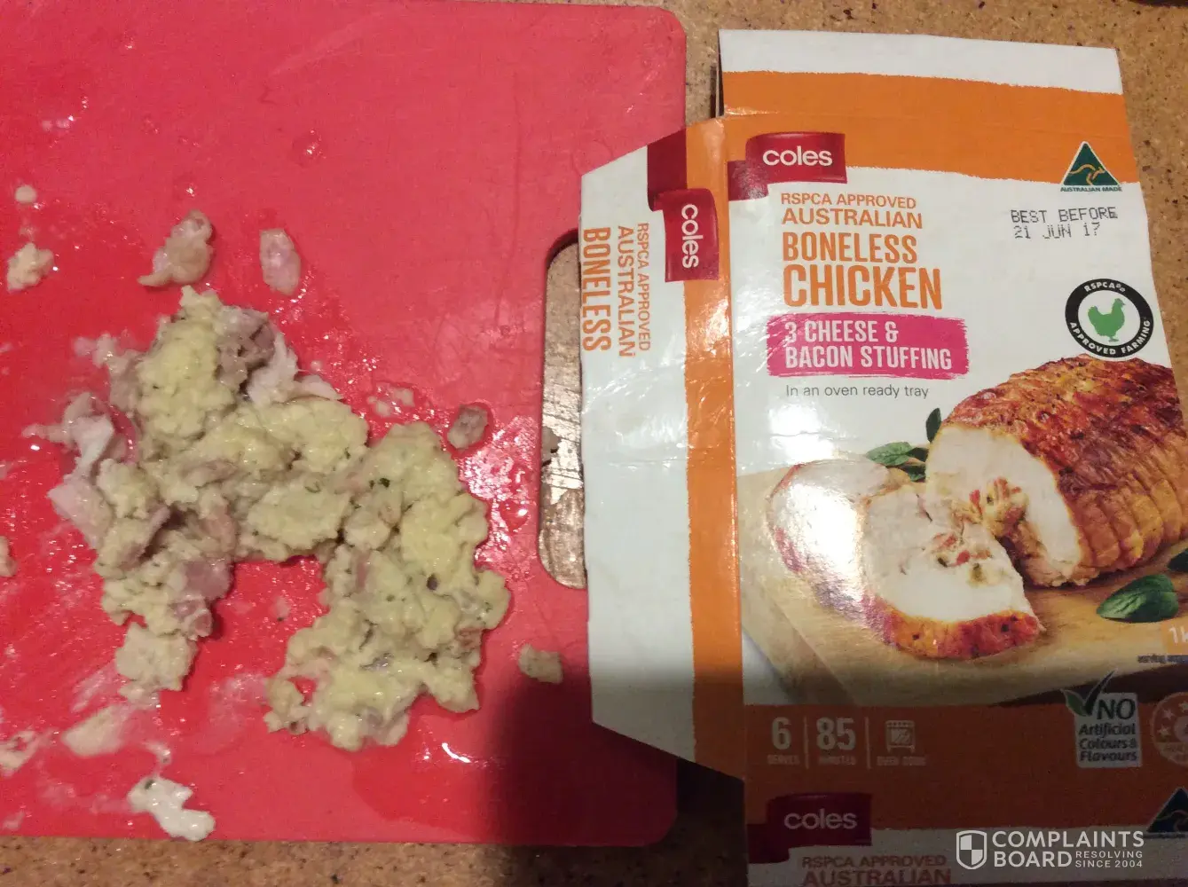 Hi Guys, I want you to know that I'm a loyal customer for Coles and have never had a complaint in the past about your produce. I'm 40 years old and live in Tasmania. I brought your boneless chicken with 3 cheeses and bacon stuffing costing $15 for a meal with my family of 4 from your store in eastlands in Hobart. We adheared closely to the instructions on the back of the packet on how to cook. Once we took it out of the oven and carved it up the cheese on the inside curdled and there seemed to be hard bits in the stuffing. Unfortunately we were unable to eat it. Can you please reimburse us for our loss.