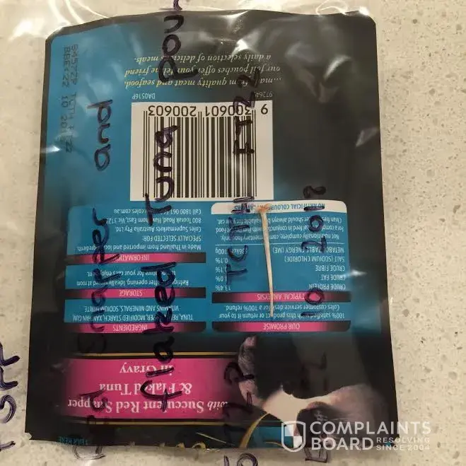I saw the bone, that had pierced the roof of his poor little mouth. Our cat had a mouth perforation and thusly, we had to treat him with antibiotics afterwards. I have attached in the photos with this complaint, the size, date and package information. Please contact me as soon as possible; I am truly horrified that I have yet to hear any response. If I do not hear a response soon, I will take this to social media. I am appalled, our cat, whom we rescued and paid money to do so and have nurtured could have died that night, without me having surgical knowledge and my fiancee and I thinking quick. We only shop at Coles, but have deeply decided to take our business else where. Considering we have two cats, we have stopped buying purr altogether, since this horrendous and traumatic incident.