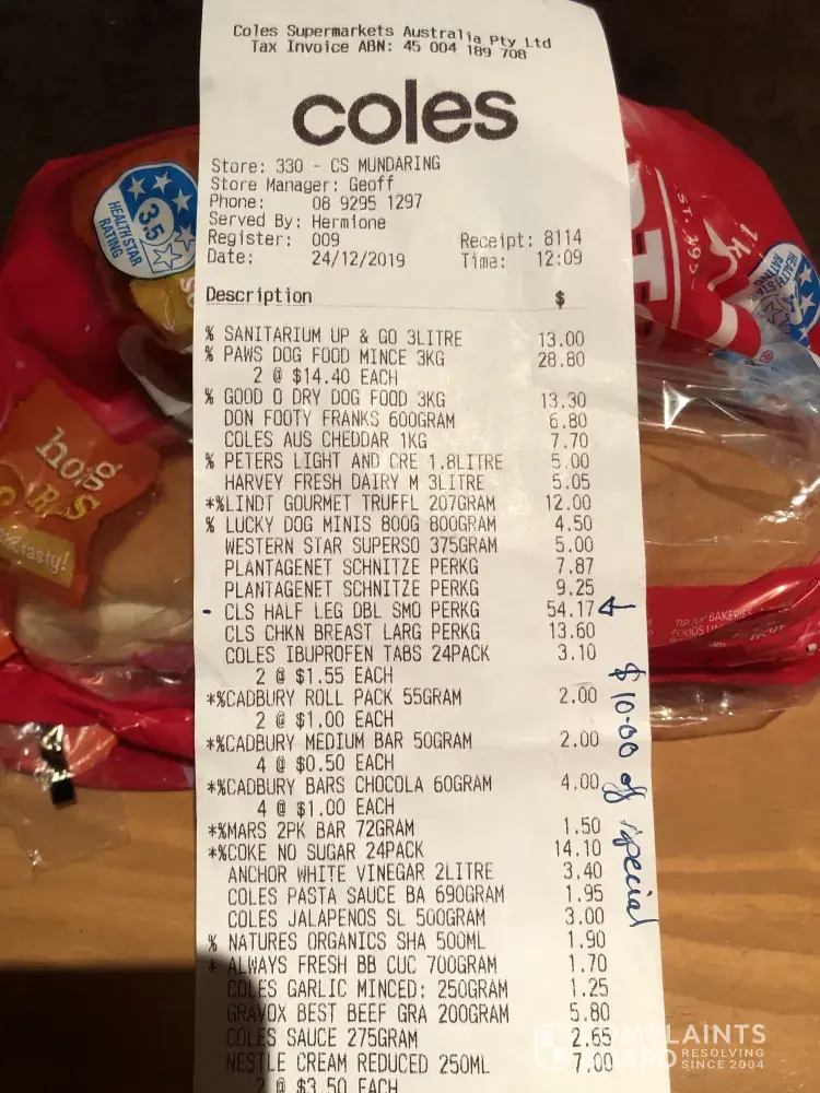 Travelled 140kms for shopping on Christmas Eve. Purchased a Christmas Ham as it was advertised in store as a special. Travelled back home and by that time the store had closed as I had seen on the shopping docket that the Christmas Ham had been charged at full price. I only shop once every fortnight or so as we live in the Wheatbelt region of Western...