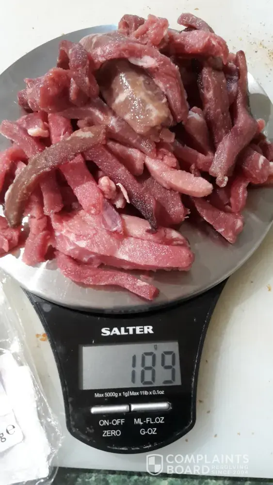 4th photo - whole package broken down into its components; Product package, first 250g on scales, second section of meat 189g beside the scales.