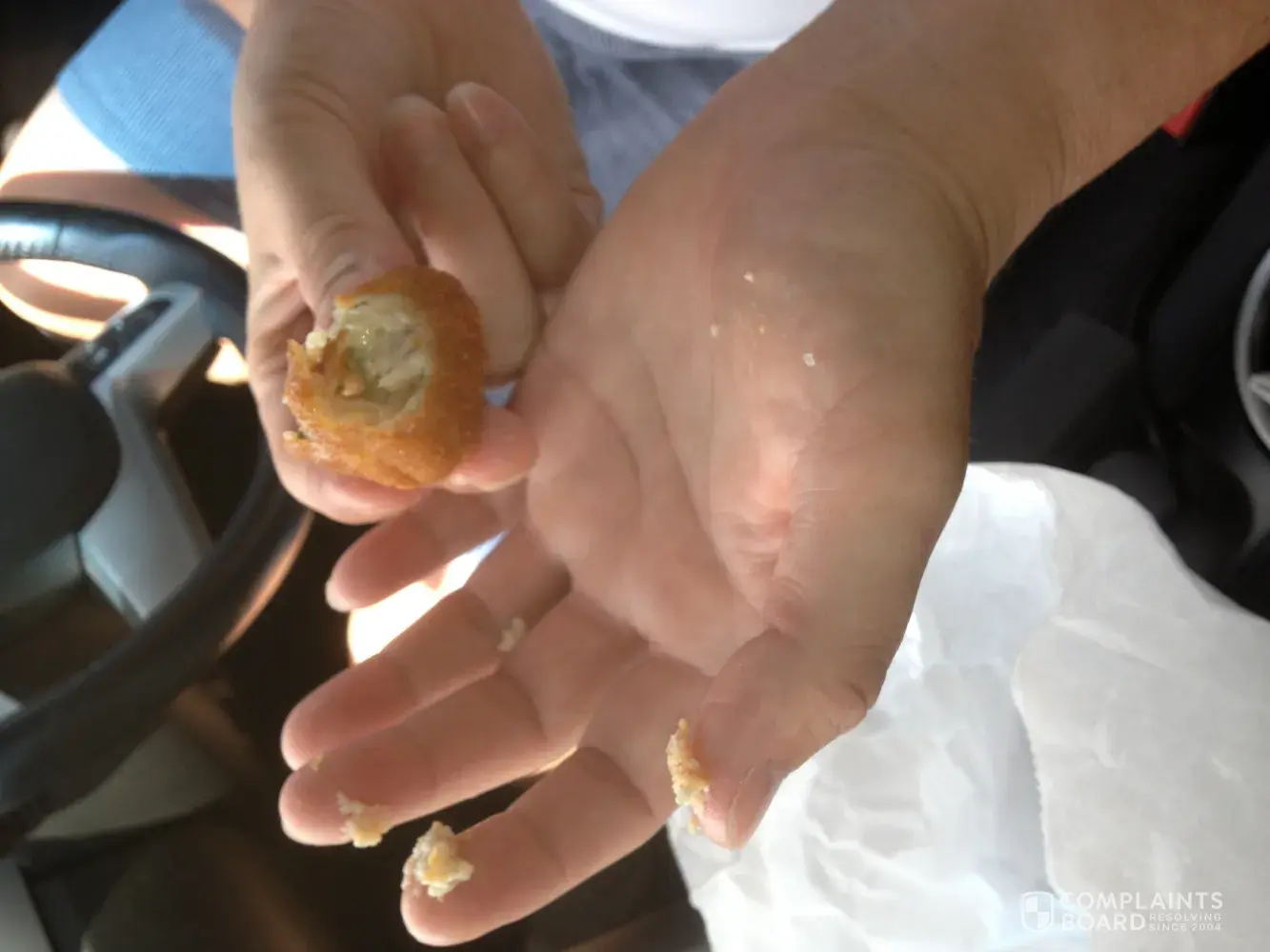 I recently purchased a serving of your chicken and garlic balls from the Army base "Robinson Barracts" and to my disappointment as I was taking a bite felt something sharp, grinding in my teeth. At first I thought I had chipped my tooth but soon though there's too much in side this chicken ball. I managed to search through my mouth full, and to my absolute disgust I found what I believe to be small, very sharp shards of this plastic or glass.