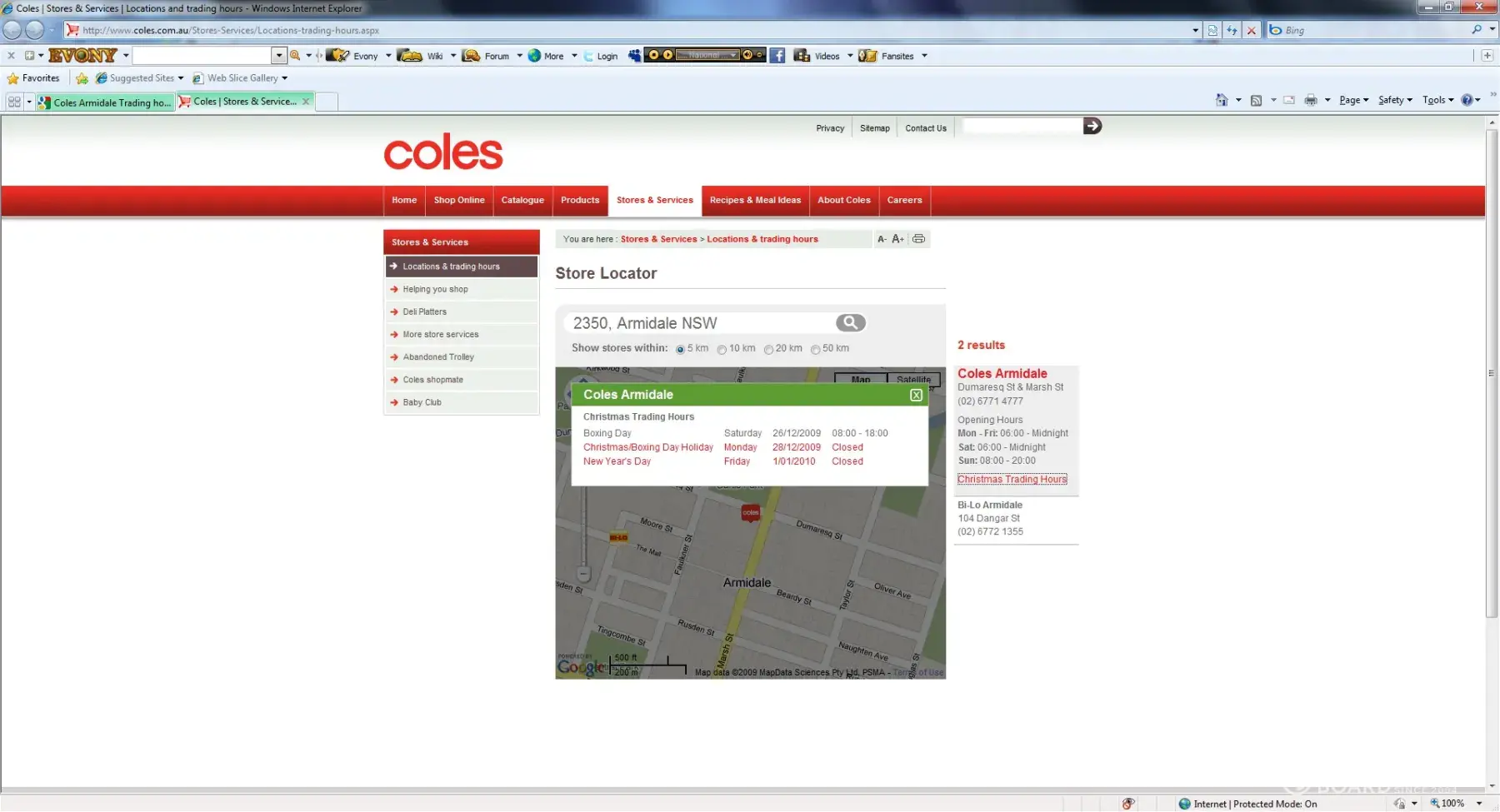 According to Coles own web site the Armidale branch was supposed to be open between 8AM and 6PM on Boxing day...As we live more then 20 Kiliometres out of town I made sure to check with Coles web site to make sure they would be open on Boxing day... attatched is a screen shot of the coles web site which gave the trading hours for Coles Armidale,