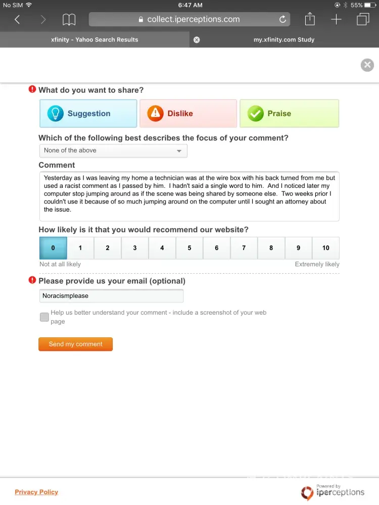 I had contact with a gentleman from Xfinity and he took the info from me.