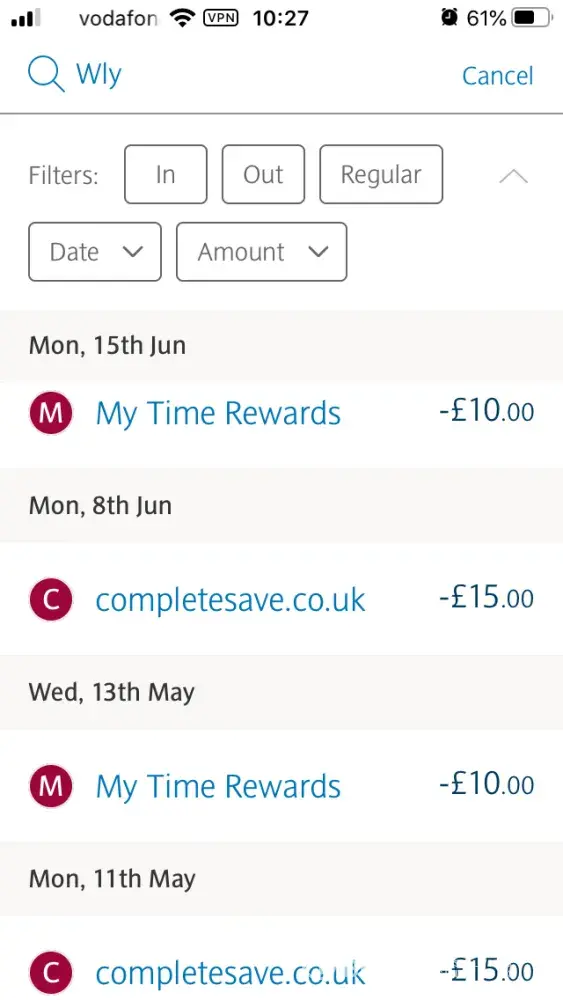I too have been a victim of wly. Checking through my bank account yesterday I noticed that £15 had been taken! I had no idea who wly was and phoned my bank who told me I signed up back in june 2019 when purchasing an item from debenhams! I've never heard of them! When calling halifax fraud team it turned out that I had automatically been enrolled and had to contact wly complete savings to cancel?! Contacted complete savings, who immediately refunded me £45 (due to go into my account within 10 days) and sent me a refund form by email for the rest. I haven't yet heard back just a generated email but in total I am owed £195 for 13 payments! This is an absolute scam and disgrace. I thought the £15 coming out of my account was for my halifax reward account not a fraud company like wly.
