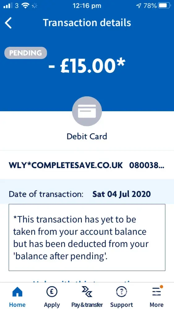 I have just received an unauthorised pending transaction of £15.00 gbp to my bank account from wly*completesave. C but I do not recall ever registering with this company or their services nor have I ever heard of this company?